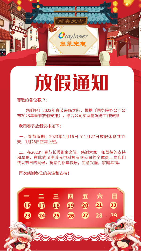 二、在2023年春節(jié)長假到來之際,感謝大家一如既往的支持和厚愛,在此武漢奧萊光電科技有限公司的全體員工向您們致以節(jié)日的問候,祝您們新年快樂,生意興隆,家庭幸福。